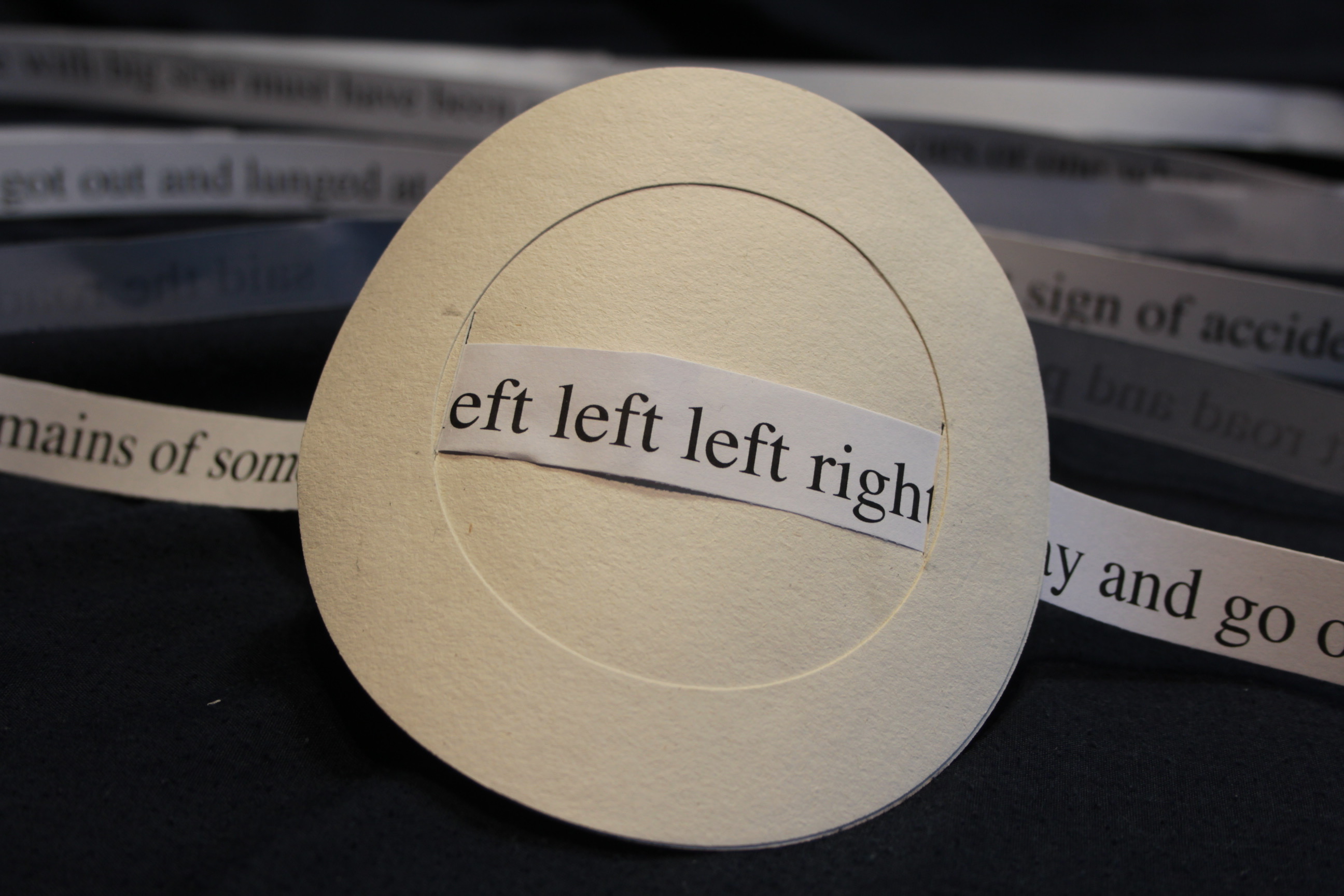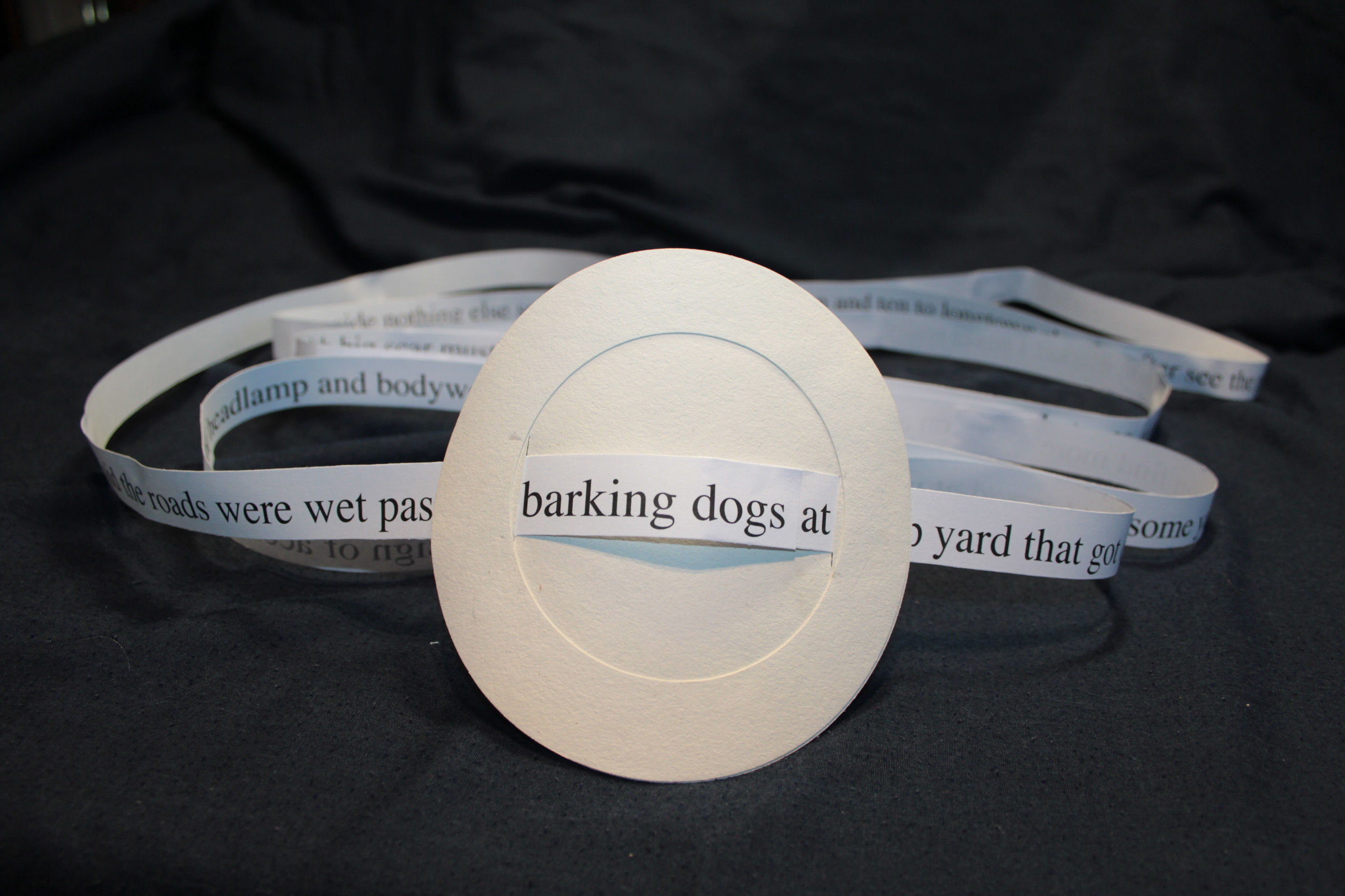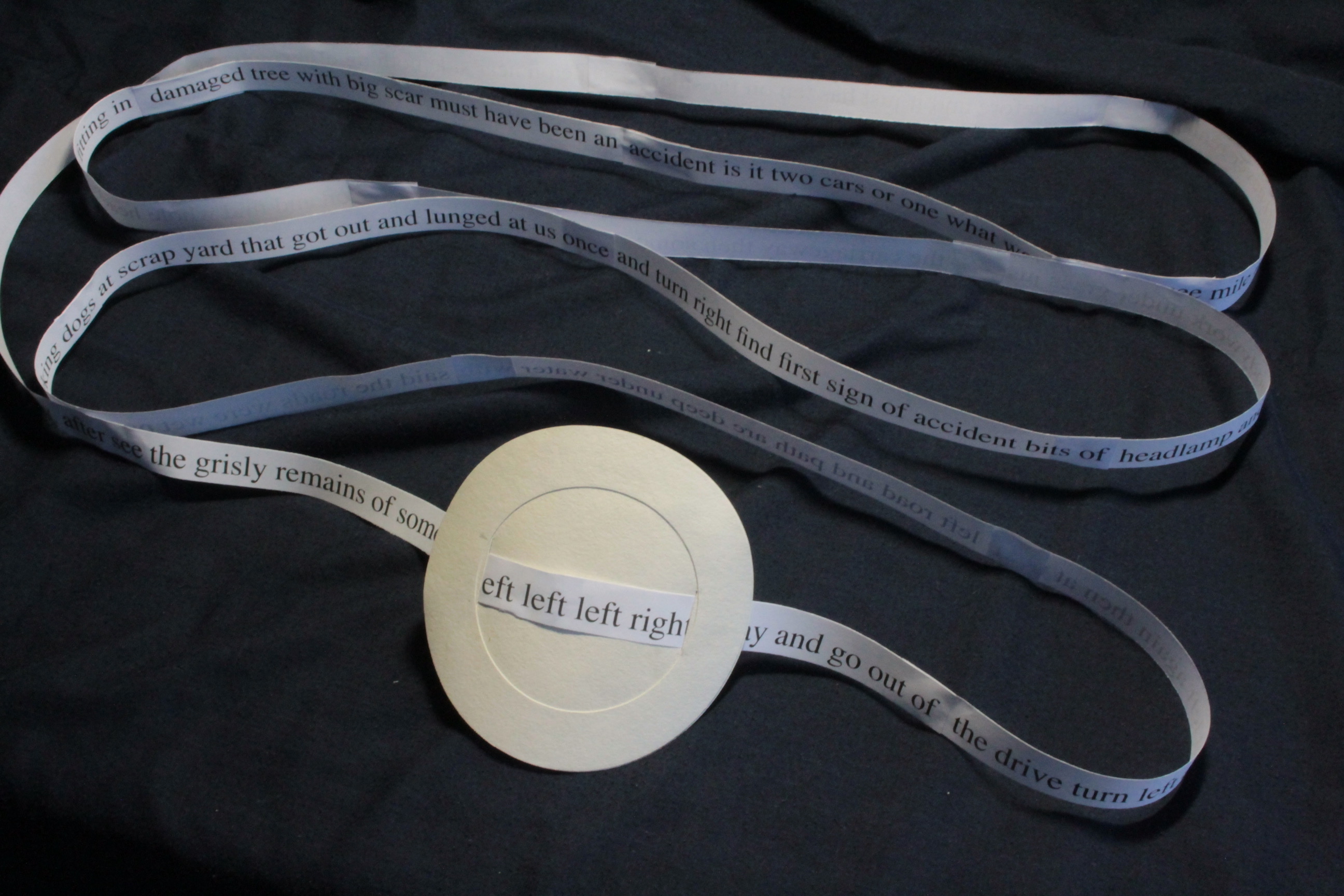 I could find no name for it at the time and still cannot. That it has no name interests me seeing as it is mostly words. The original image I had in my head was of a circular object made of stiff paper with cuts to allow a tape with words on it to pass through it, like a line of text. This was my idea. My intention was to make it and see what it had to say. My preparation was to fiddle about making prototypes and find a form that worked for me. Then I made it.
