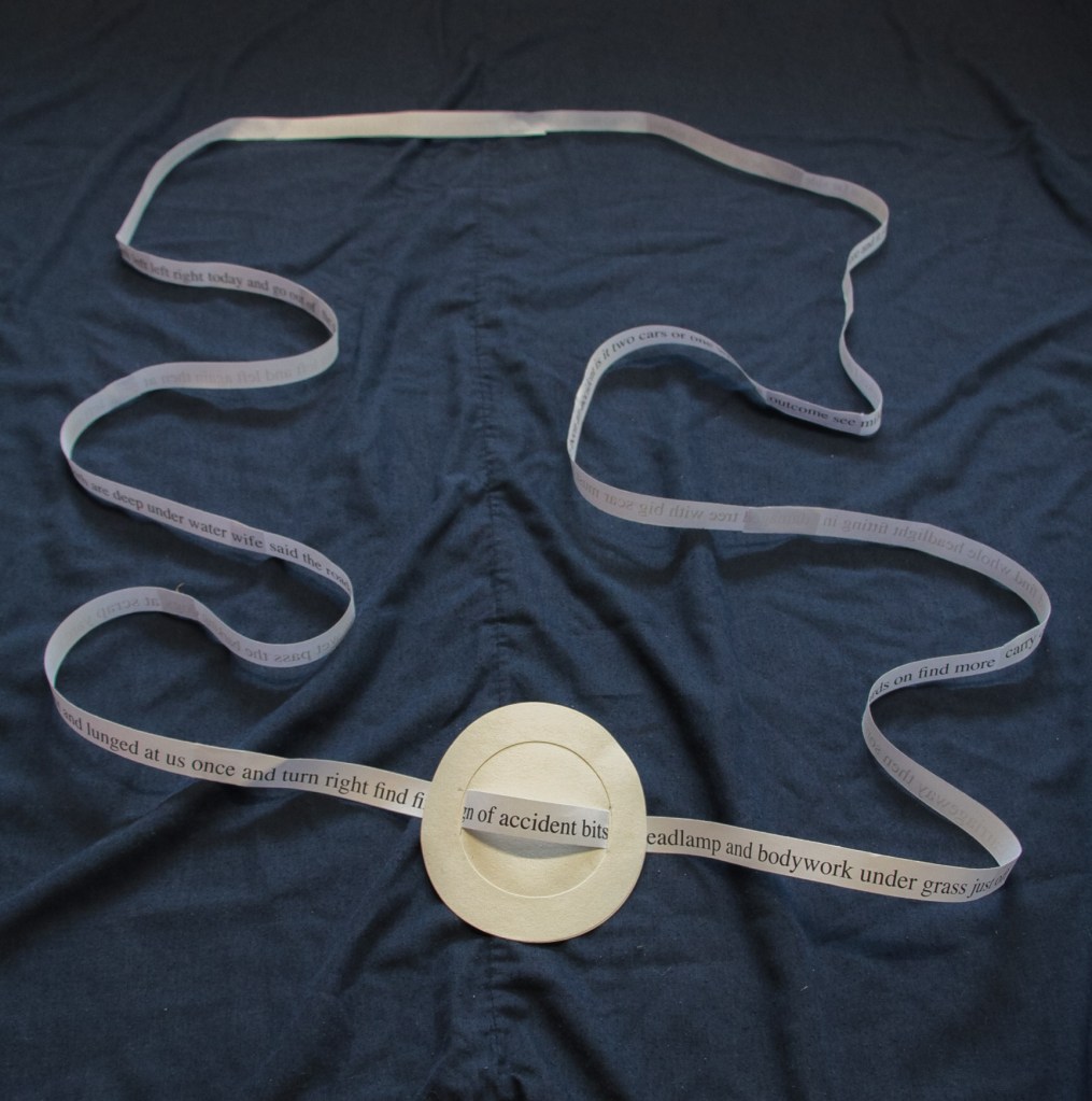 So I started with a stream of consciousness on the walk, I turned it into a string of unpunctuated lowercase words, I wrote them down on a page and the string became a block, I took them to a ribbon to recreate the linear experience of the walk, then I looped them to make them fit in the object. But the object I made remained physically consistent. On reflection the making of the object both explored and expressed the experience, not only of the walk, but the experience of making the object as well. I still find finding the words to describe this lived experience difficult.