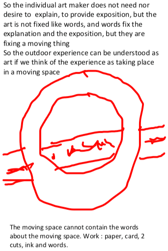 My proposal is that we can make art as experiential learning to conduct subjective research to explore and express personal experience, including outdoor experiences. I see this as an adventure, which taken from the Latin adventurus ‘about to happen’, which also makes this an oxymoron. The thing about to happen does not currently exist, and when it comes into existence it is no longer about to happen, so it cannot be what it’s name claims it is. It feels like trying to explain things by giving an explanation of the thing.
