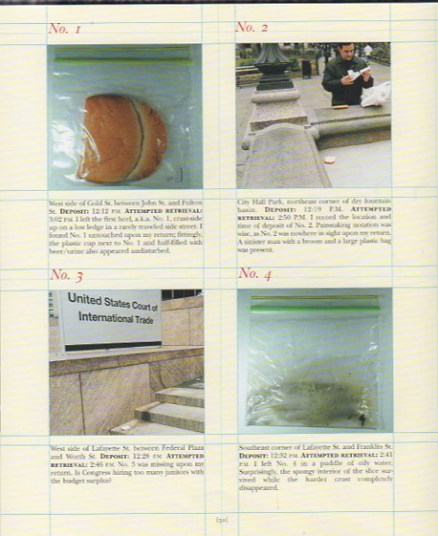 In Speck: A Curious Collection of Uncommon Things by Peter Buchanan-Smith, the artist Robert Lemons writes “On a dreary day in March 2001, I undertook an experiment to test the utility of pieces of bread as trail markers. In the Brother Grimm fairytale, Hansel laid a trail of crumbs to guide Gretel back home… But would a bread trail work in the modern world?”