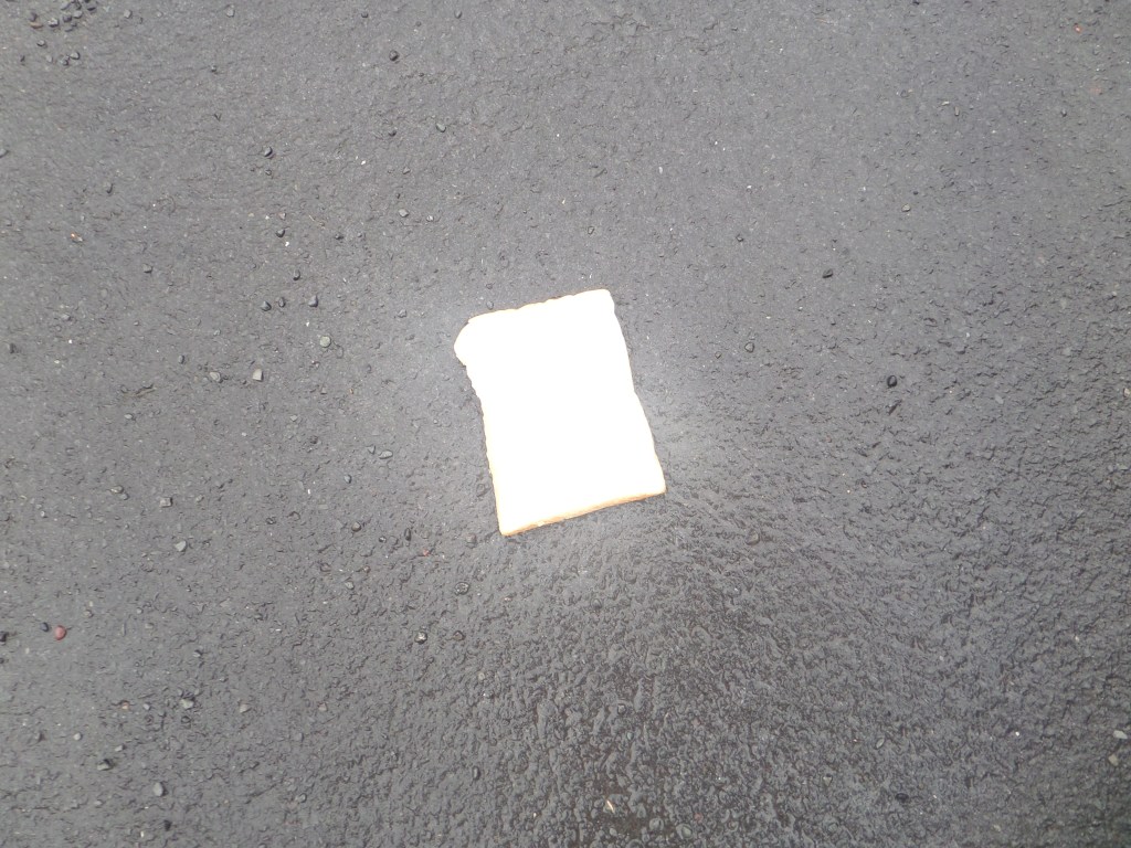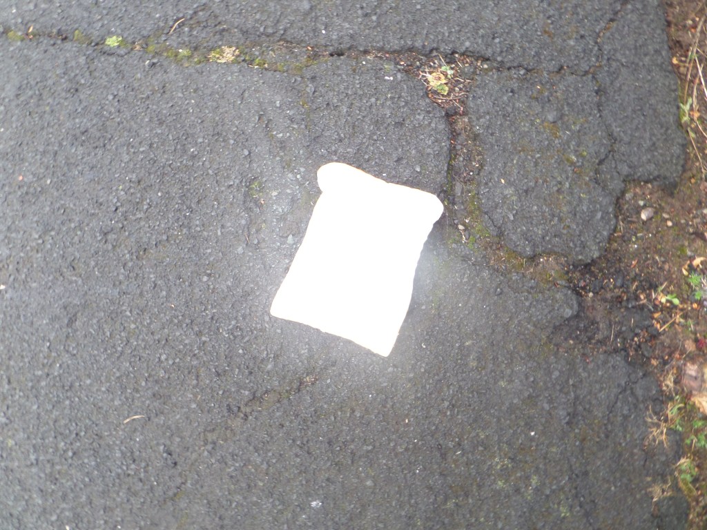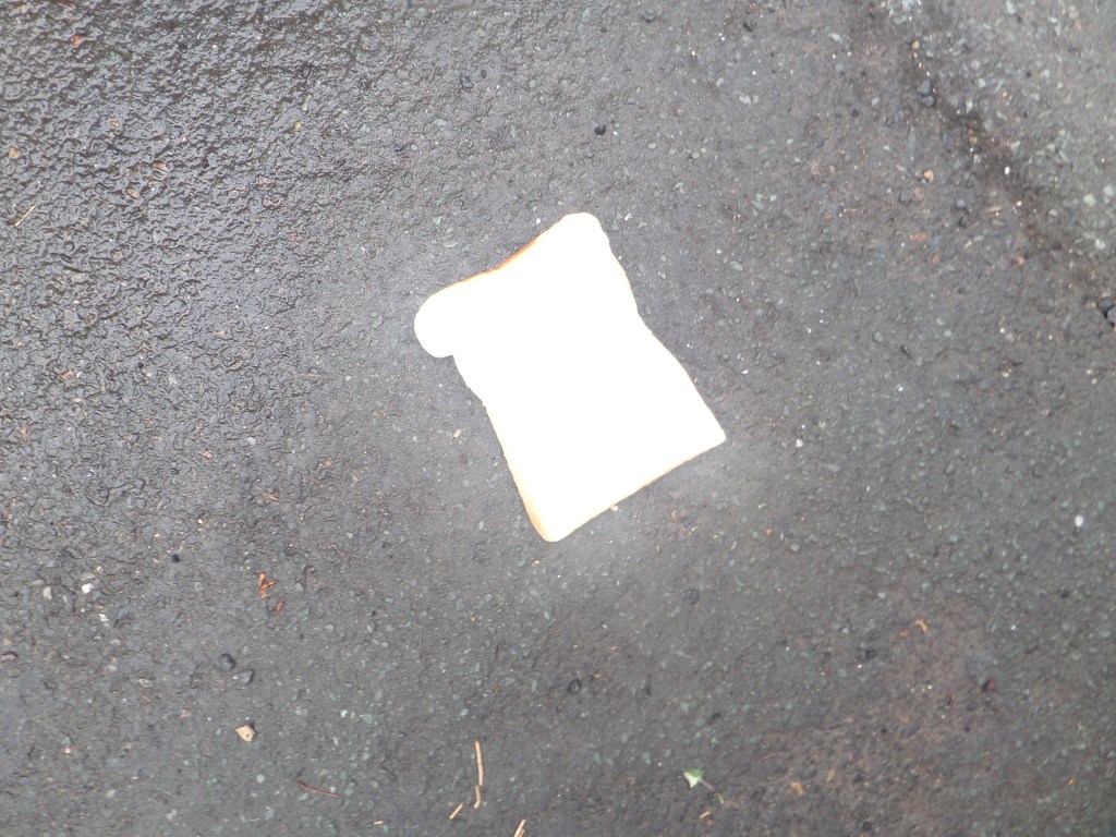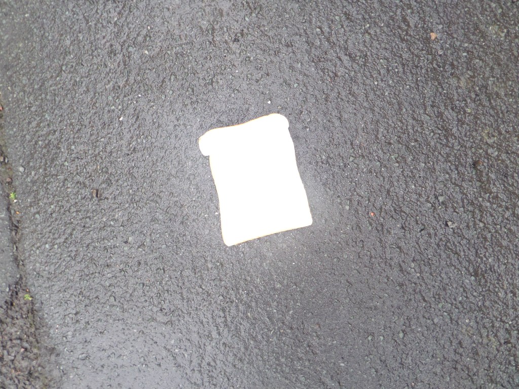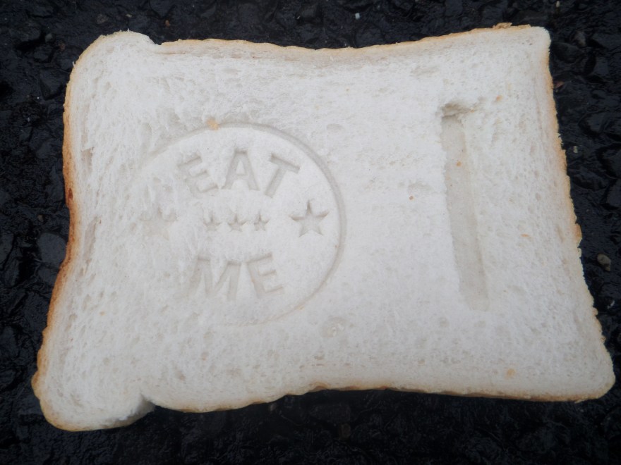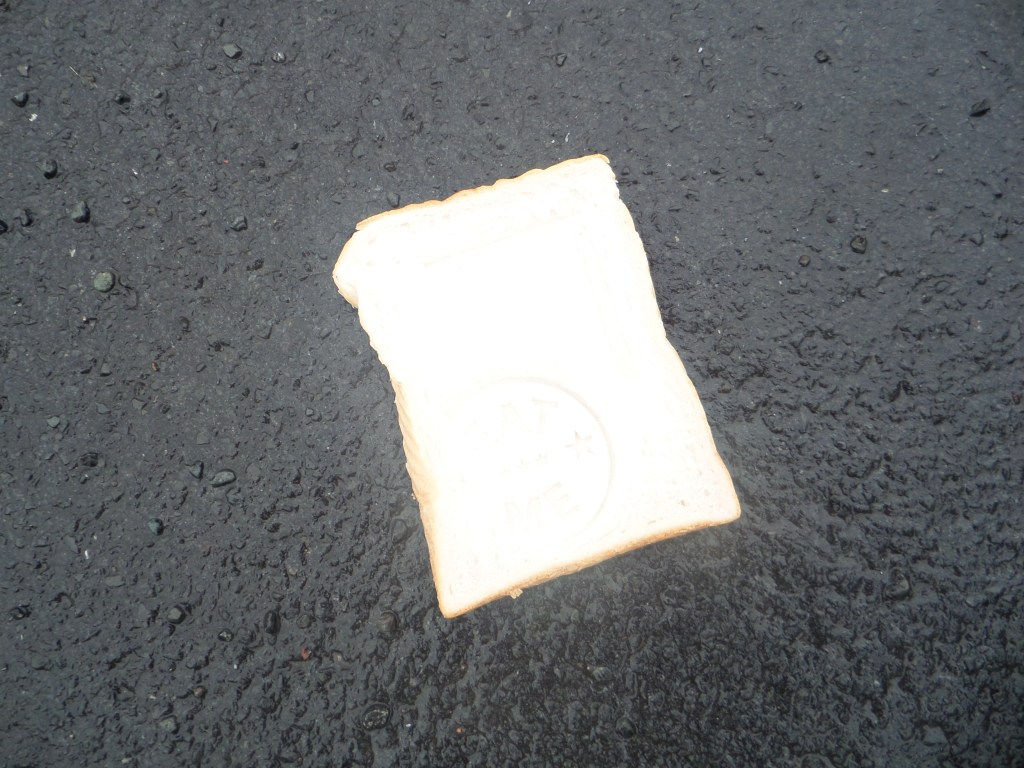 I could wander around the place where I live, with a bag of bread, with slices imprinted with words and symbols, and drop them and photograph them on the ground along a route from my house to the telephone exchange where the internet comes in, like Hansel left a trail of breadcrumbs to find his way home when his father took him and his sister out into the woods to murder them. Any questions?