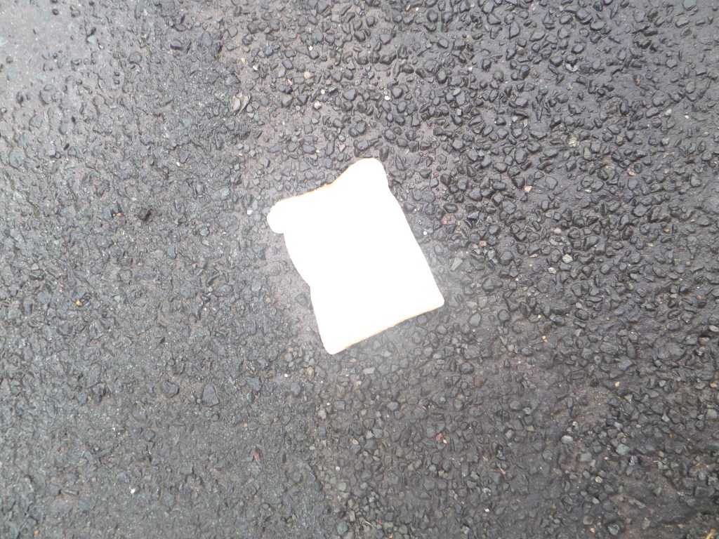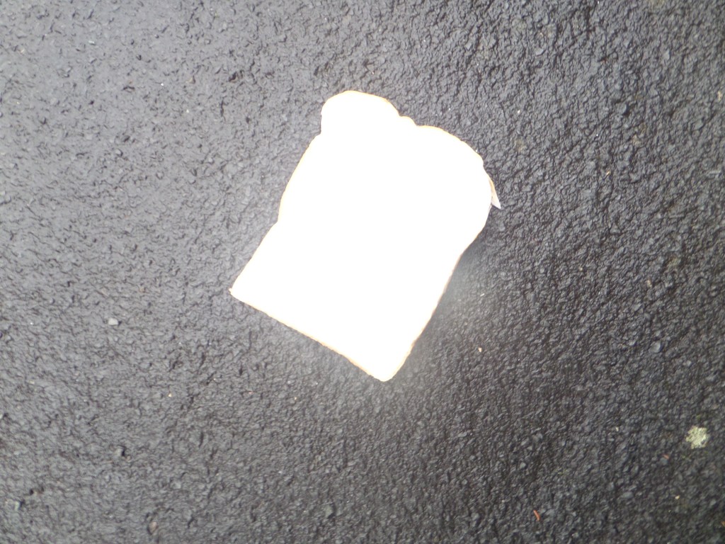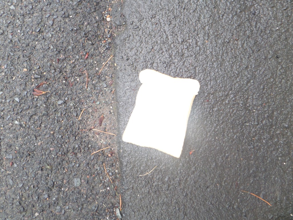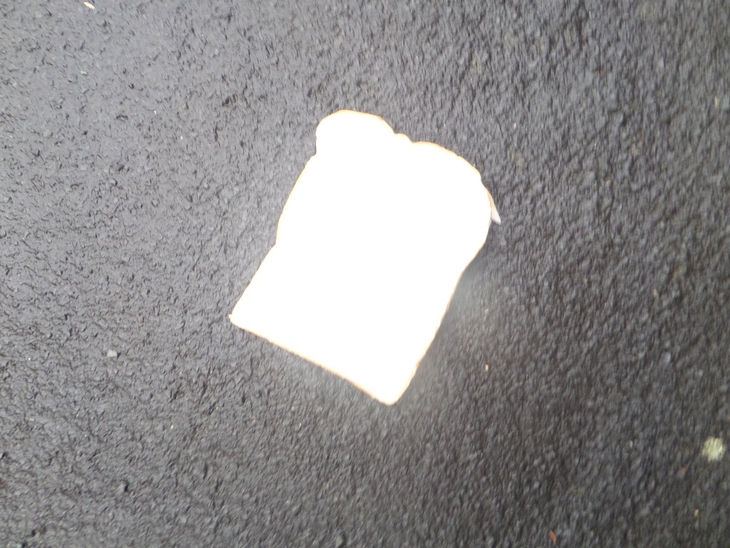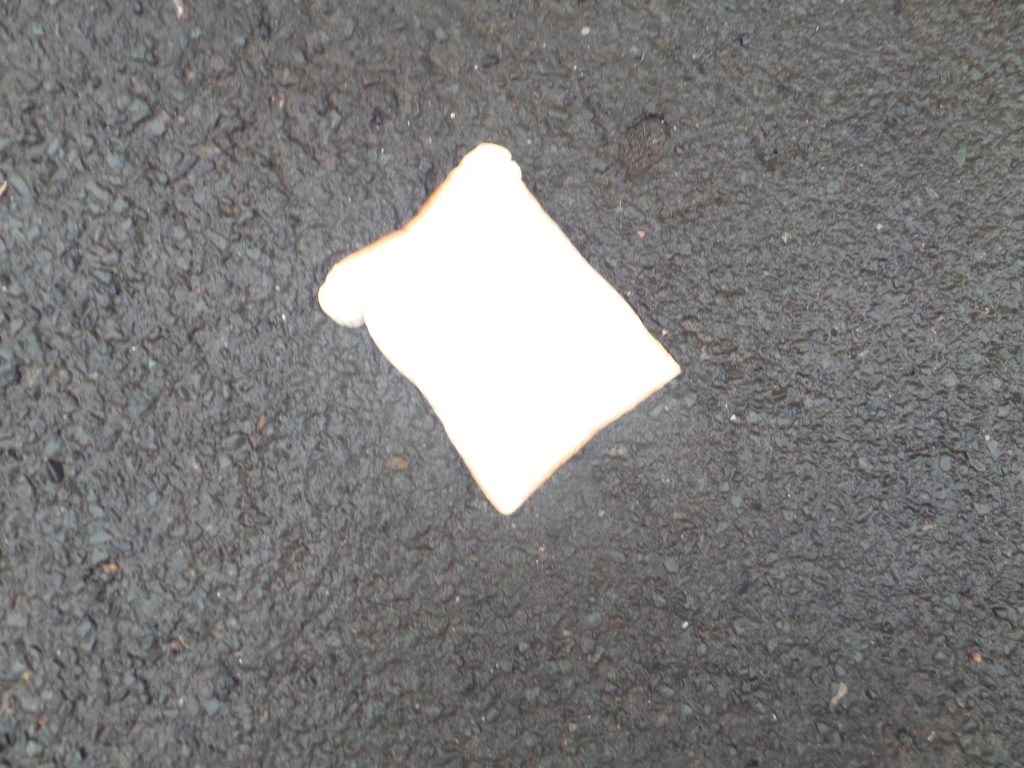 I could wander around the place where I live, with a bag of bread, with slices imprinted with words and symbols, and drop them and photograph them on the ground along a route from my house to the telephone exchange where the internet comes in, like Hansel left a trail of breadcrumbs to find his way home when his father took him and his sister out into the woods to murder them. Any questions?