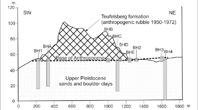 The caption says…’The Teufelsberg Formation was built of war rubble including concrete, brick, clinker, rock, fly ash, slag and solid chemical waste, deposited between 1950 and 1972, forming the highest elevation of Berlin. Thin Holocene deposits may locally separate the Pleistocene and Anthropocene units.’