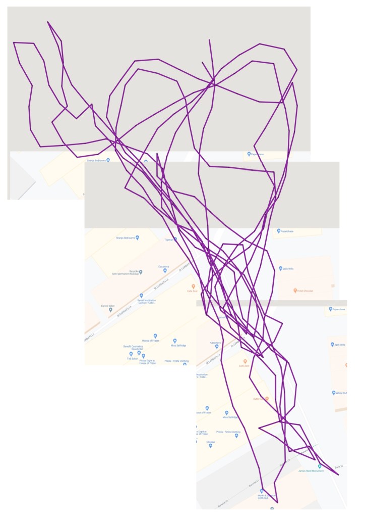 On the basis that art and performance can be used as research, to explore and express personal experience, I wondered what would happen if I walked through Carlisle town centre maintaining 2m social distancing, but do it as performance, choreographed like a dance or with applied dramaturgical principles, and record it with GPS.